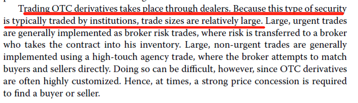 这是错的,因为现在监管的施压,OTC衍生品只有较为标准化的,有中央清算存在的品种流动性是上升的,而那些不适合中央清算的产品流动性反而是下降的。而因为这些OTC衍生品都是大型机构之间进行交易的,因此交易规模是较大的,而非较小。