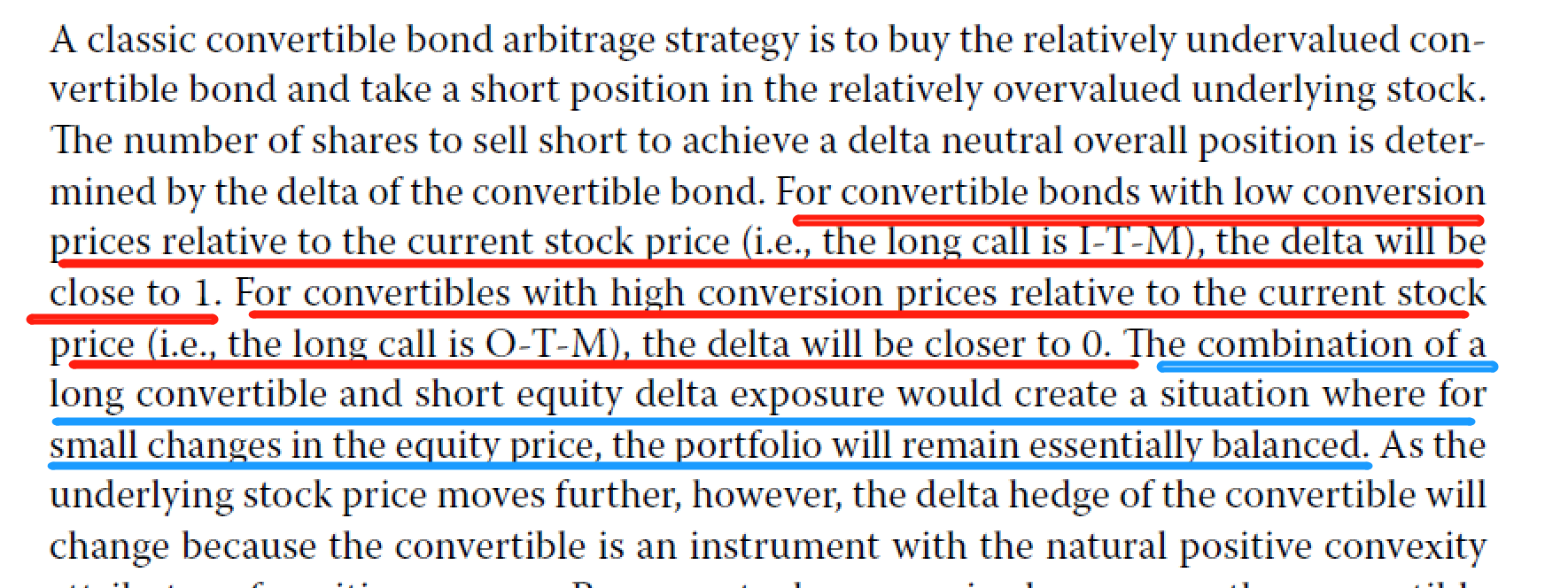 “If the convertible bond’s current price is near the conversion value, then the combination of a long convertible and short equity delta exposure will create a situation where for small changes in the share price and ignoring dividends and borrowing costs, the profit/loss will be the same.”可转债套利是无风险套利,无论股价怎么变动,都不影响可转债套利的利润。原版书上这句话好像是说套利利润不变是有前提条件的:可转债当前的价格要接近转换价值?