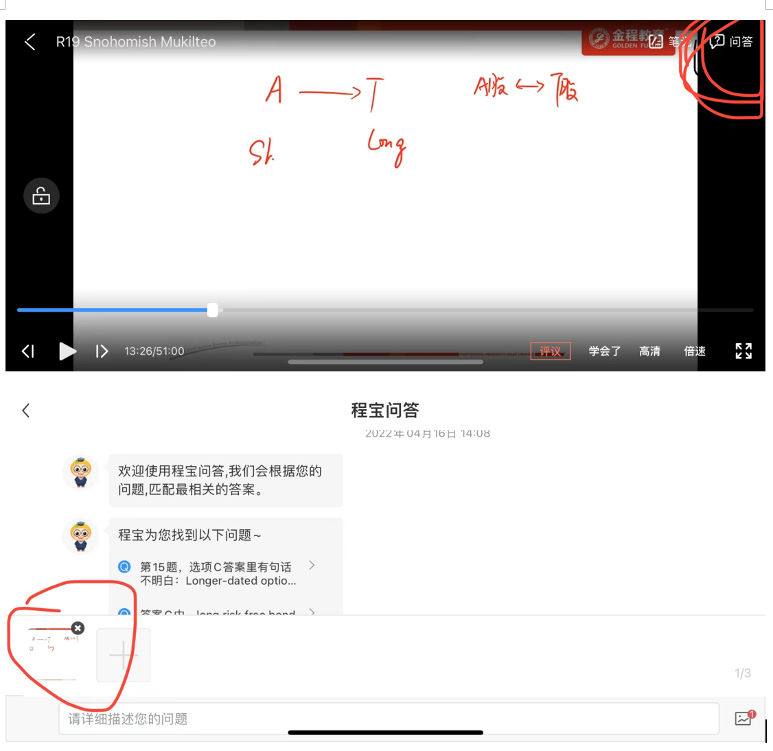 2、在网校AAP视频的右上角点问答,提问界面会生成一张默认的图片,即同学此时观看视频的截图。同学也可以自己截图上传。