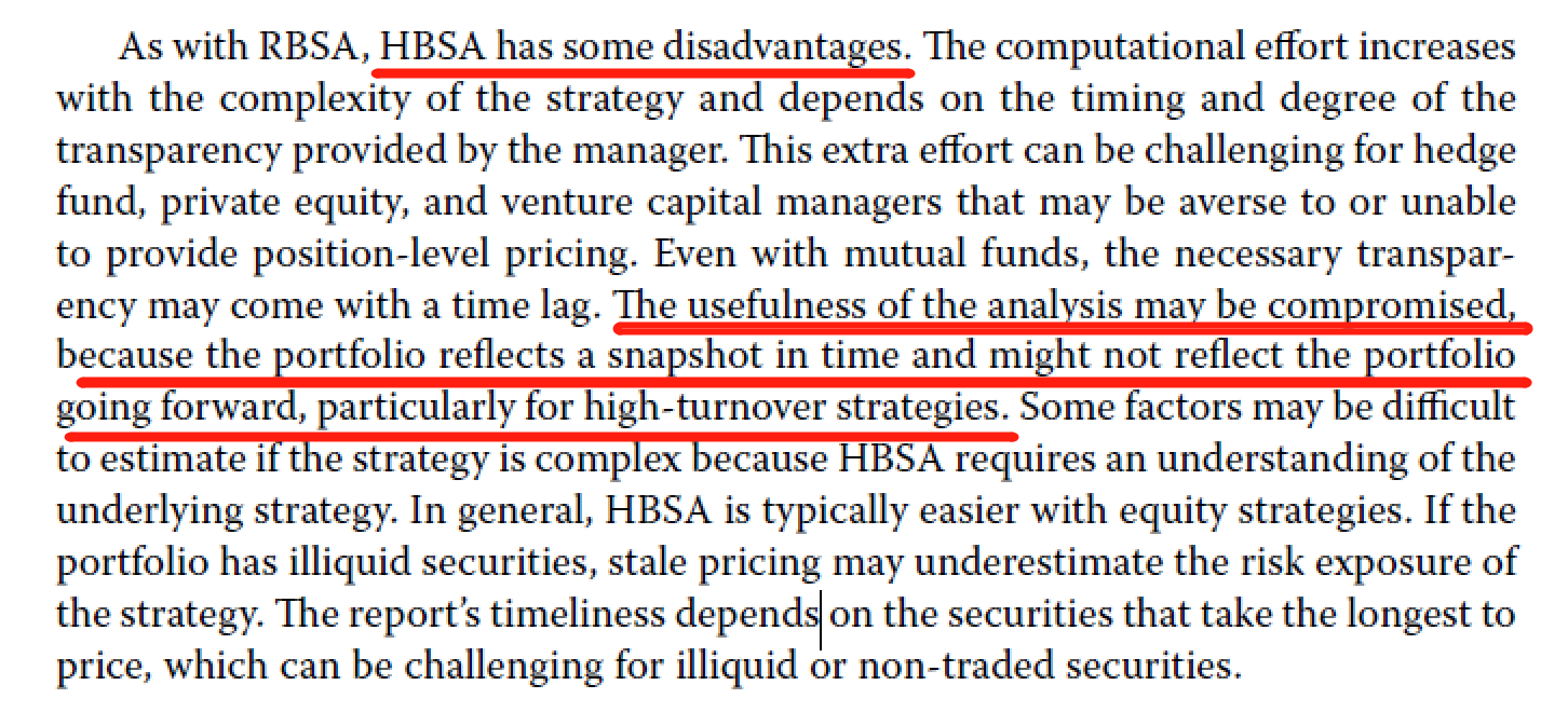 同学你好,HBSA只看某个时点的持仓,是无法反映之后组合持仓会如何变化。对于换手率高的组合,它是会有频繁交易的,持仓也会有显著的变化,那么基于一个时点的持仓来进行风格分析就不太有效的了。