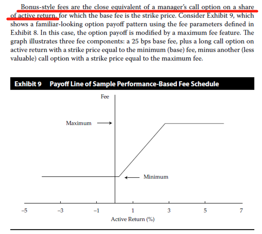 同学你好,Carpenter是有minimum fee,也就是说不管业绩多差,Carpenter最少可以拿到0.18%。它的payoff 相当于long了一个行权价为base fee的call,当业绩比较差时获得base fee。但因为Carpenter还有maximum fee,因此还相当于short了一个行权价比较高的call,当业绩高到使费率超过maximum fee时,费率仍然为maximum fee 0.8%。(整体payoff如图二所示)