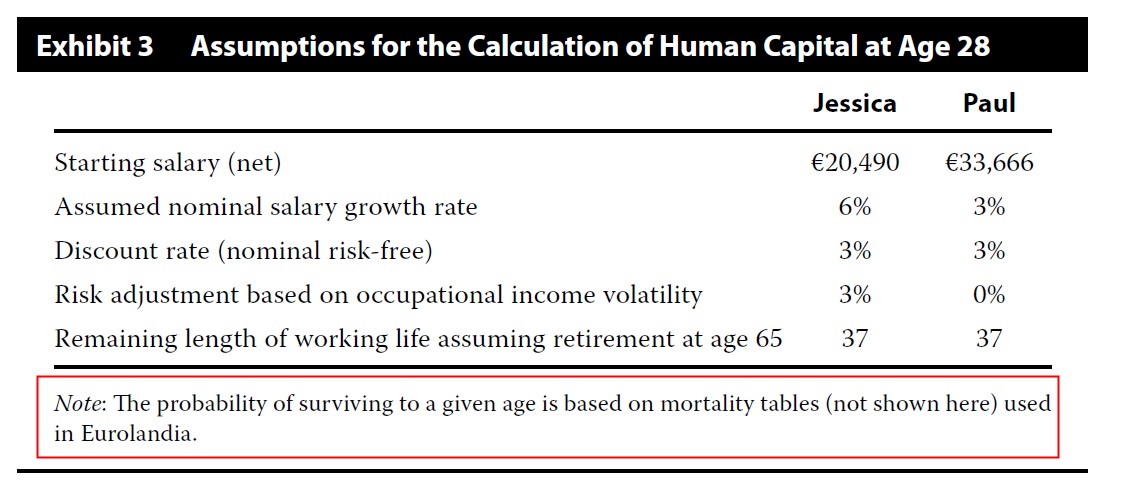 但在下面计算保险的时候,我们在计算human capital的时候,是假设这个人能获得这一辈子的工资,因此他是没考虑存活概率的,所以算出来的现值是更高一些的,由于增长率和折现率是一样的,都是6%,相当于不折现,因此现值就相当于工资乘以37倍,即20490乘以37=758130,约为758000.