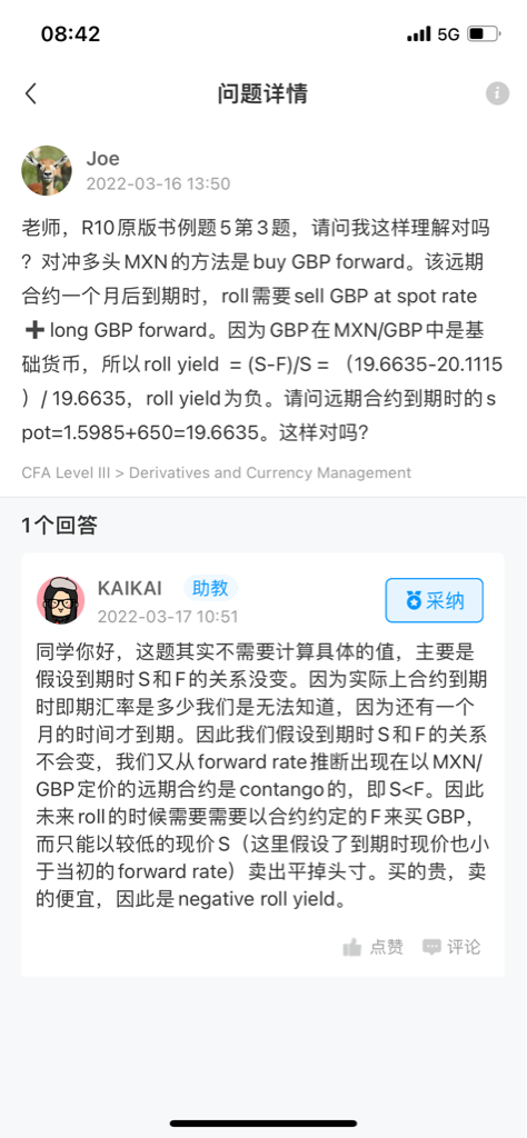 老师,R10关于roll yield,以DC/FC的货币标价形式为例,如果是远期升水contango的话,roll yield=(F-S)/S。我不确定的是,上述公式里的F应该是t=0时签订的远期合约所约定的远期价格(F0),而S是t=T(也就是原远期合约到期)时的现货价格(ST)。由于此时roll yield是positive的,所以contango中的F大于S,其实指的是F0大于ST。老师,请问我理解的对吗?