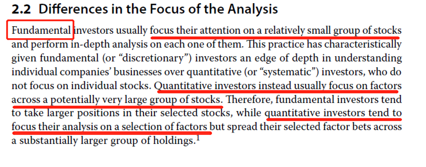 但discretionary approach也不是不能diversified,只要团队人手充足,大型机构确实可以对广泛的个股进行深入分析。因此如果题目中给出条件说有一个fundamental的基金持股是分散的,也不用觉得矛盾。但一般情况是discretionary approach持股相对集中,systematic approach持股较为分散。