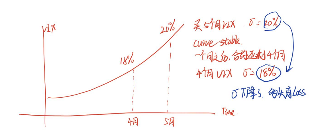 因为VIX是升水,因此就算将来波动上升,但是随着VIX期货到期时间的临近,我还是有损失的,因为波动会越来越低,但是我是VIX多头,说明我的标的资产价格在下降,这一点对我不利。所以交易1并不好。