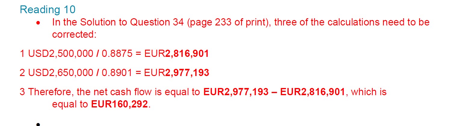 第一步:需要先把原来的2.5m美元空头头寸平掉。那么就需要以spot rate买入2,500,000美元。相当于卖出EUR,那卖出EUR作为投资者来说肯定是吃亏的,得卖的便宜,因此spot rate应该用0.8875而不是0.8876,所以卖出EUR的金额是2.5m USD/0.8875 USD/EUR=2,816,901 EUR (支出EUR,买USD,因此EUR是现金流出)。