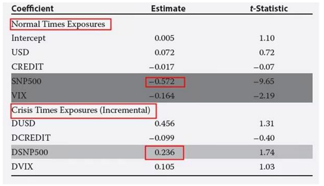 这个模型就是要分两种情况,一种是危机时刻,一种是正常情况。这样我们就可以以分析在危机和正常情况下对冲基金在各因子上exposure的差异。下面举个例子(下图),这是一个采用dedicated short-biased 策略的对冲基金用conditional risk factor model的回归结果。我们可以发现,在危机时期这个基金在标普500这个市场因子上整体仍然是负的(normal+criss = –0.572+0.236=-0.336),但负的exposure没有那么大,因此可以推测在市场下跌的过程中这个基金降低了一些空头头寸。
