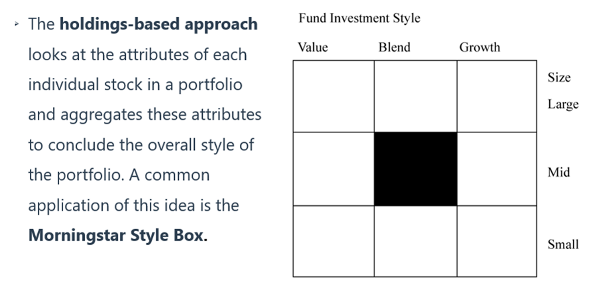 同学你好,style box是属于holding based approach的。它是根据成长性和市值大小两个风格维度来划分组合的风格类型的(见图)。而确定这两个维度要通过组合的持仓数据来计算它的持仓整体是大盘还是小盘,风格是成长还是价值,它是holding-based。