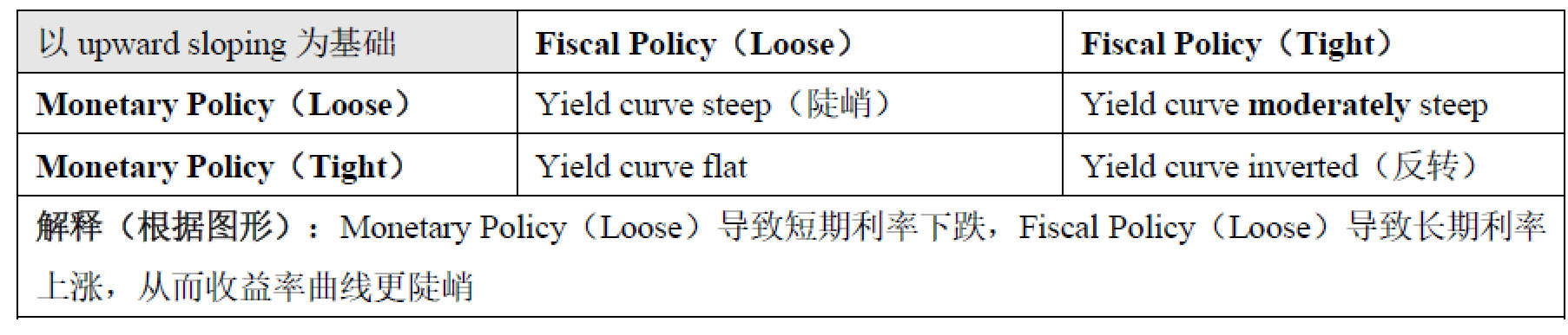 而Fiscal Policy(Tight)和Monetary Policy(Tight)会导致Yield curve inverted。