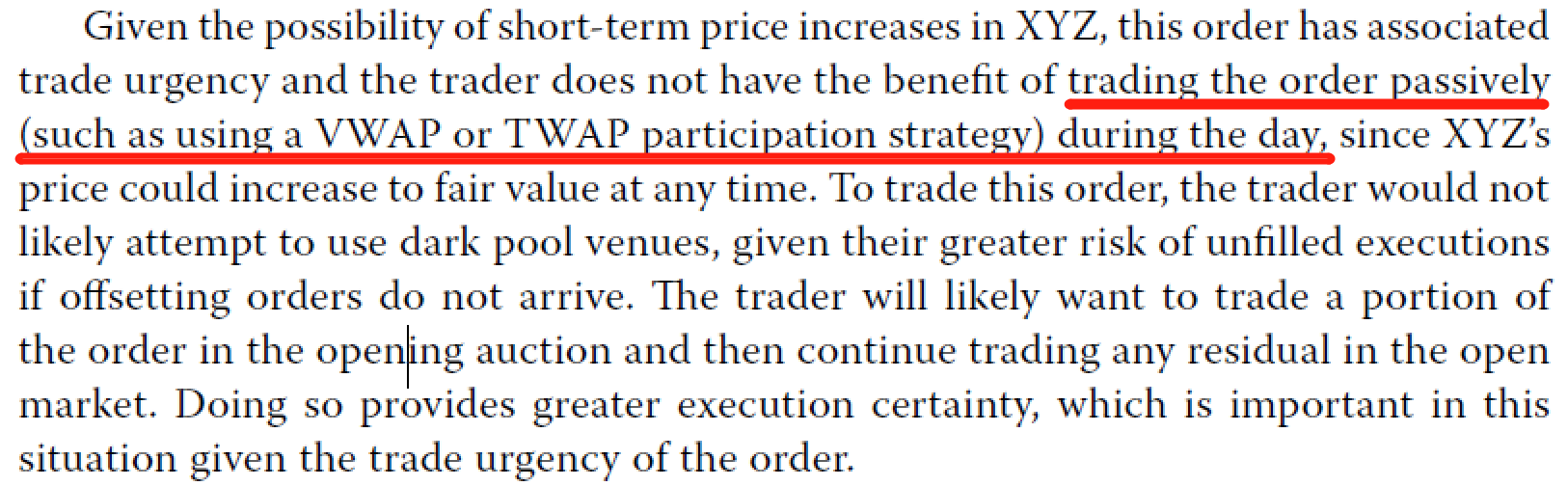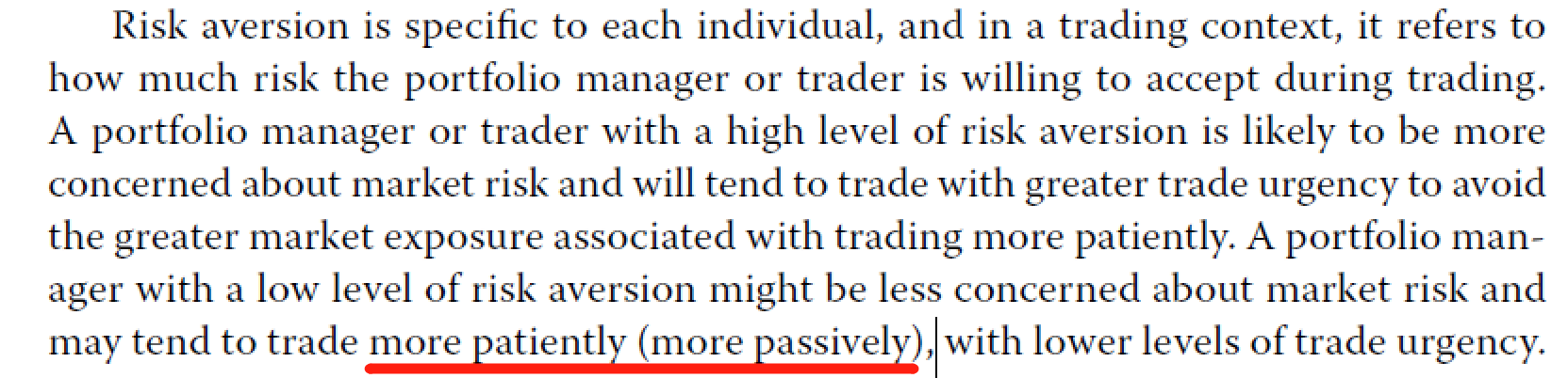 同学你好,trading passively指的是在一天内慢慢交易,我们可以参考它在原版书中出现时的上下文去理解。通常Scheduled (POV, VWAP, TWAP) 算法交易的安排是分布在一天内的每个交易时段去进行的,因此此类算法属于trading the order passively during the day。不适合urgency比较高的order.