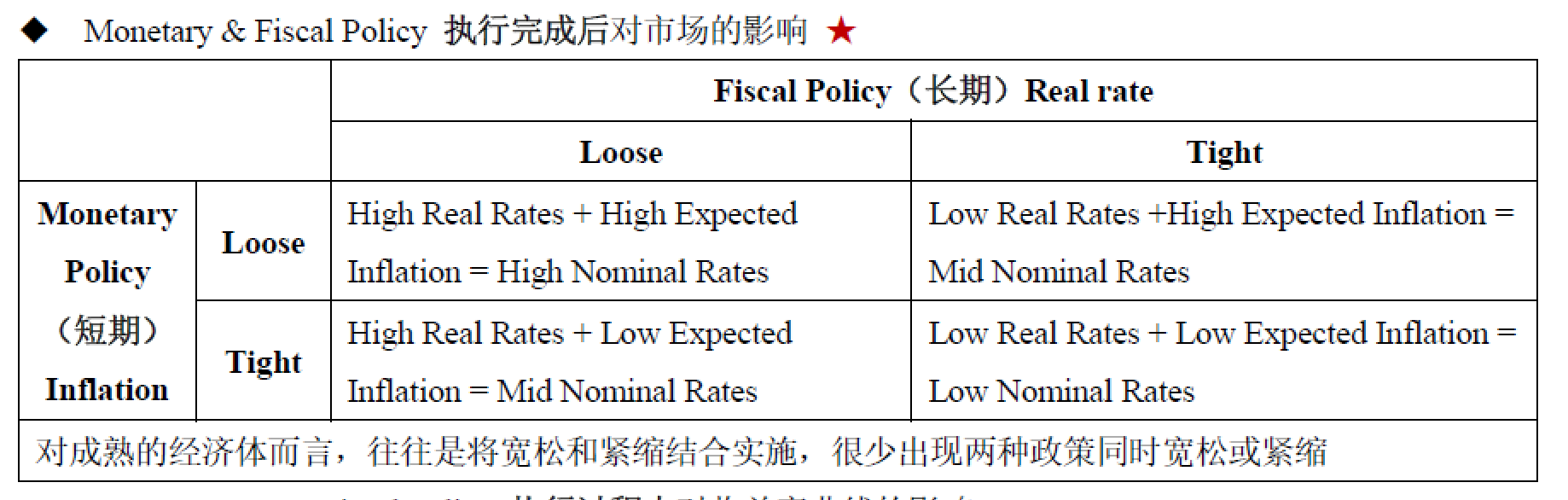 这里讨论的是Monetary & Fiscal Policy 执行完成后对市场的影响,货币政策和财政政策都会在执行的过程中有不同的影响,并且影响的速度不一样。因此在该假设下我们认为货币政策影响预期通胀,而财政政策影响真实利率,如图所示。