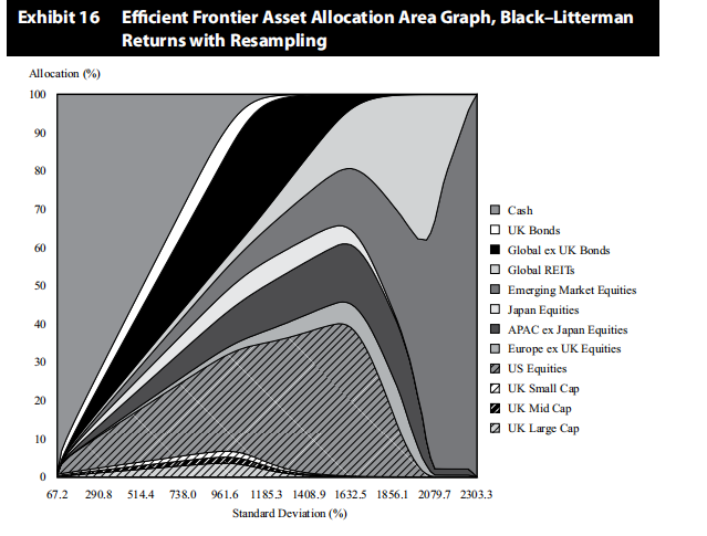 同学你好,resampled MVO就是MVO与MCS的结合,他就想当于通过MCS来模拟出成千上万条efficient frontier然后取他们的平均。这里就会涉及重复抽样和随机数的问题了,就是先用MCS模拟一个frontier,然后再重新用随机数结合MCS再生产一个frontier,就这么产生上万条frontier取平均。它的缺点是源于下图,他是resampled MVO所得出的结果,可以看见整个配置存在许多凹陷的部分,而正常的MVO的拐角处都是直线;此外过度分散化也是从图中体现出来的,配置出来的最优组合包含大量资产,分散化过度,而传统MVO的缺陷是分散化不足,因此resampled MVO就是矫枉过正了。Lack of foundation in theory是它没有理论基础,完全都是考数量统计技术来达成的,依赖于随机性,而不具备经济原理。