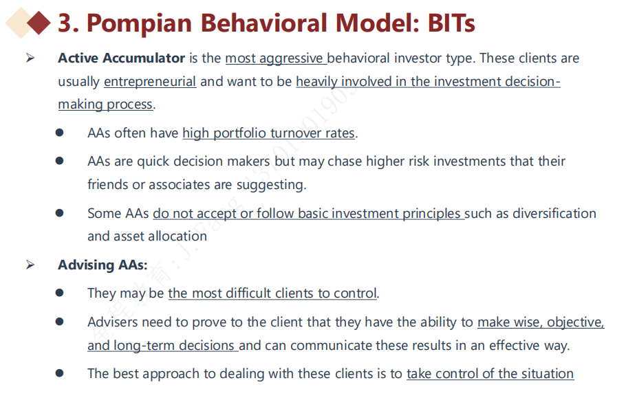 同学你好,可以和讲义进行一一对照后得出。Mikaele自己创办了公司而且很成功,他会很积极主动地参与到投资决策过程中,而且投资的周转率很高。下图是AA的特征,通过和Mikaele的情况进行对照就能发现他是AA。AA的特征是富有企业家精神,会大量参与到投资决策过程中,投资周转率高,快速做决策,不愿意分散化。