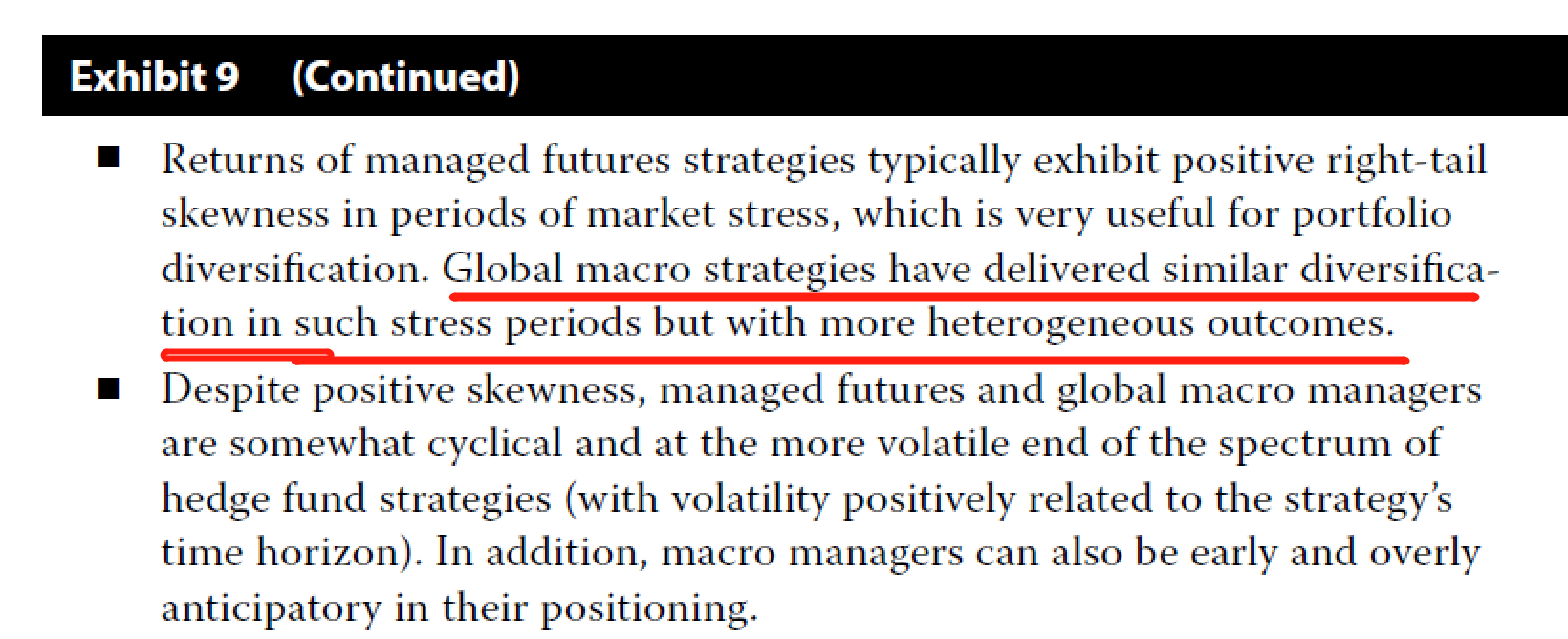 因为global macro投资的资产是比较丰富的,不论是股债衍生品还是大宗商品贵金属都可能会去投资,而且投资经理会对市场做一个预判,不是说完全追求市场的趋势,有时候看到好的机会会提前埋伏,然后在趋势反转前就提前撤出来了,从整体来看在危机时表现相比传统资产是好的。但原版书上也写了,不同的global macro策略呈现出的结果差异是非常大的。