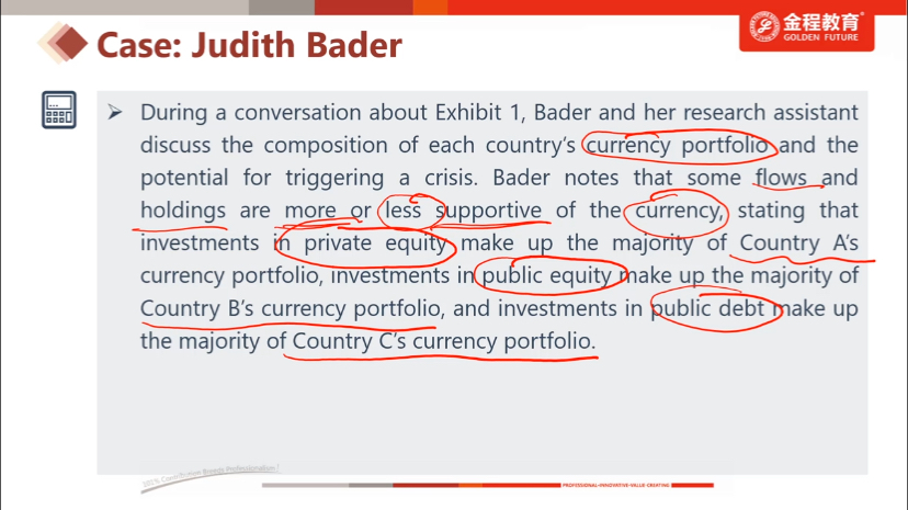 A国货币主要投资于PE,B国货币投资于公开股票市场,C国货币投资于公共债,题目问哪国最可能陷入货币危机。如果按照从好到坏的优先顺序排列的话,Foreign direct investment是最有利于本国货币的,外资会长期地对本国经济发展进行出资;其次就是private real estate和private equity,它也是长期投资;再接下来是public equity;最底端的是debt。只需记住这个顺序,FDI>private real estate=private equity>public equity>debt。