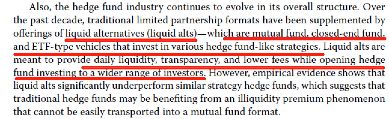 同学你好,一般来说alternatives的流动性是相对较差的。但现在市面上也有一些liquid alternatives,他们采用mutual fund、ETF等形式,投资策略和hedge fund的投资策略类似。这类产品存在的意义就是提供每天都可以申购赎回的流动性,同时因为mutual fund、ETF等投资工具本身会定期公布持仓,透明度较好,交易费用也是较低的,这样就能有更多的投资者群体可以接触到另类投资这种资产。