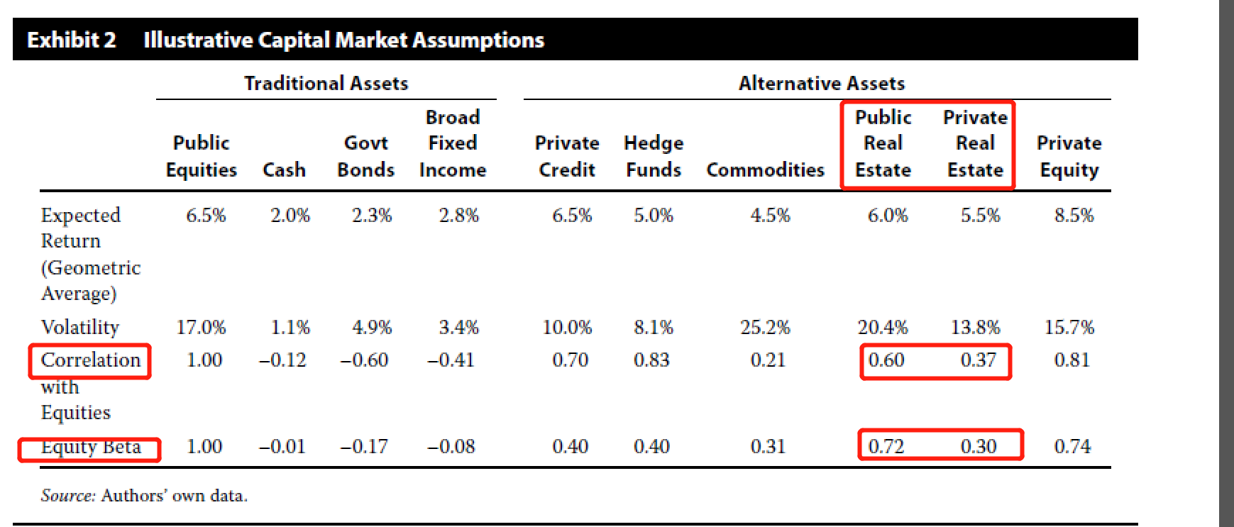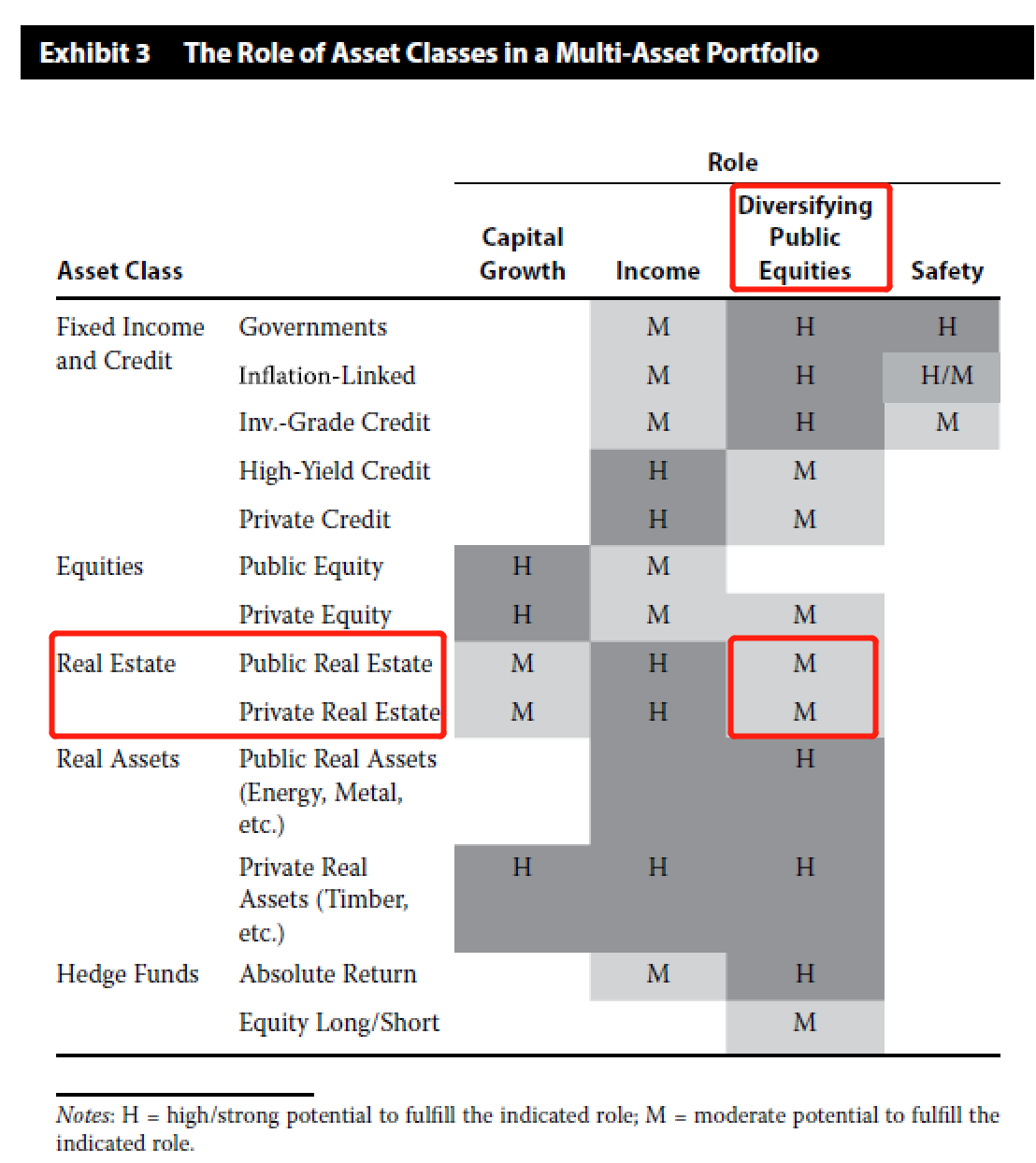 同学你好,房地产不论是private是public的,其分散化的效果都是中等(参考下图),因为房地产和equity都受宏观经济的影响,经济好资产表现就好,因此是正相关性的,但因为不是完全正相关,还是有一定的分散化效果。