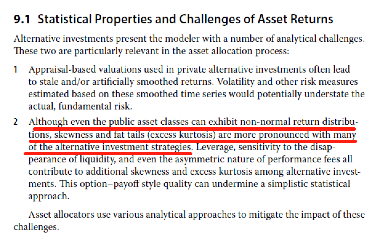 同学你好,alternatives的return通常是non-normal的,因为另类投资中通常杠杆较高,费率还是非对称的,都导致他们的收益率尖峰肥尾、有偏度等非正态分布的特性要比公开交易的股债等传统资产更加突出。