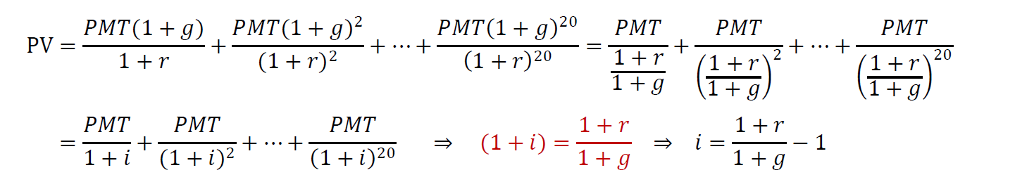 现金流每年按3.5%增长,说明这是一个增长年金,而增长年金无法使用金融计算器计算,因为每年的PMT金额不同,因此我们将增长率除到分母上,计算一个新的折现率,这样分子上的PMT金额就相同了,也就可以使用金融计算器进行计算了