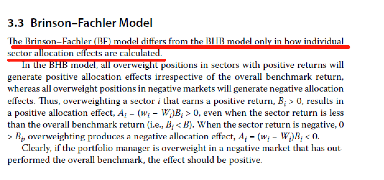 BHB和BF,翻来覆去抓不到重点…中心思想是不是说在allowcation能力部分,BF的话先拿这个行业与benchmark相比,看行业1与行业基准相比好不好。行业1没超出行业基准,说明行业1不好,但是轻配了,就更好。更体现基金经理的配置能力。BHB的话,就是单纯看这个行业收益是正的,多配就好。