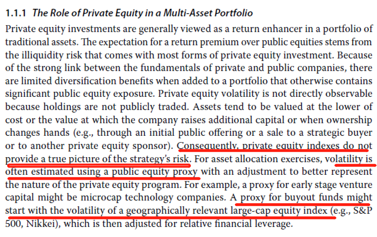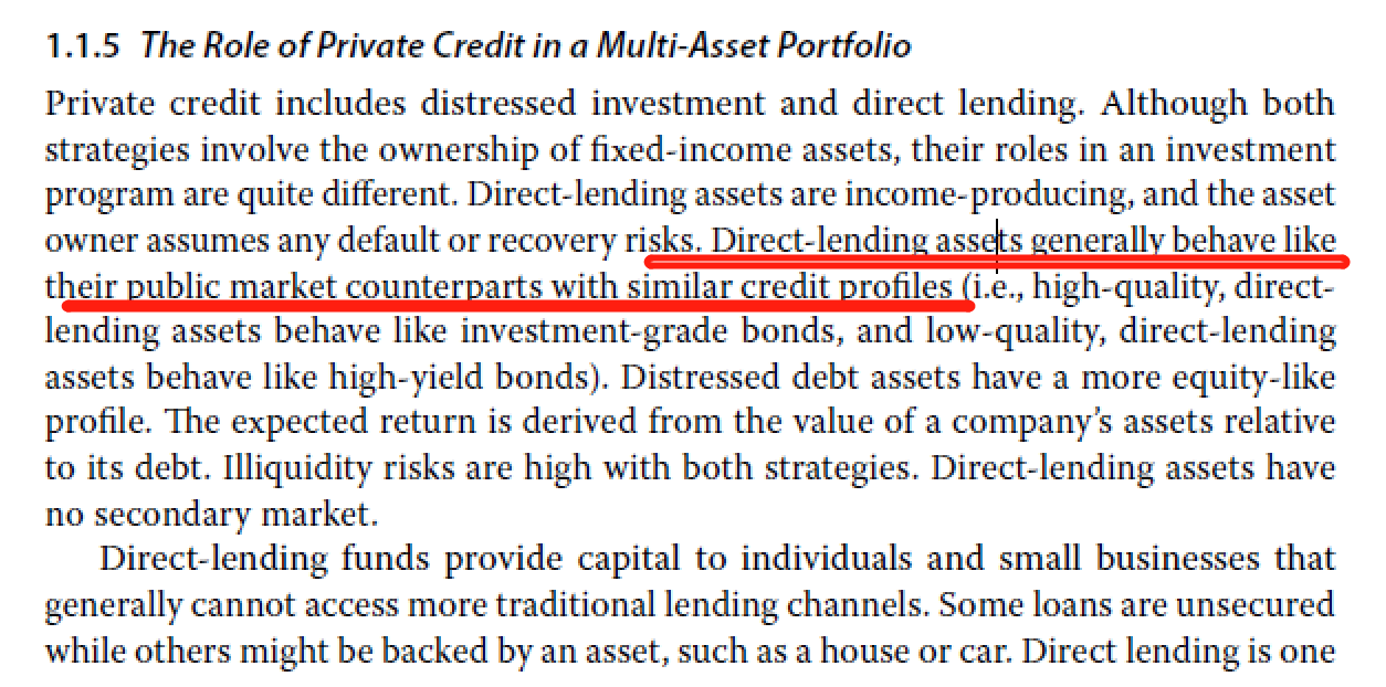 private equity因为其资产的特点,它的并没有实时的估值数据,一般的估值数据都是比较过时的。因此PE 的index用来评价PE的表现并不准,private credit也是类似。在此情况下,可以用公开交易的股票指数和债券指数来作为proxy,并调整相关的风险,这里的调整体现在在指数收益的基础上加了200个bp。