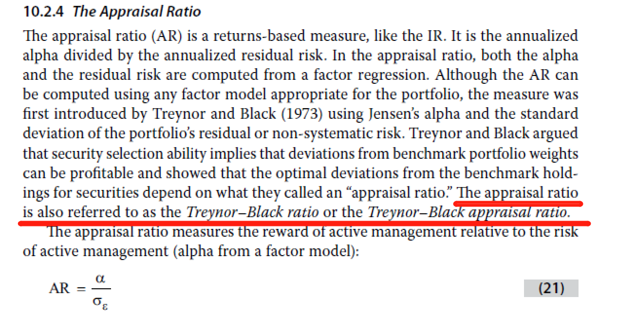 而Treynor–Black ratio其实就是appraisal ratio。名字上是有点混淆的,记住名称中有black的ratio就是和appraisal ratio等价的概念。