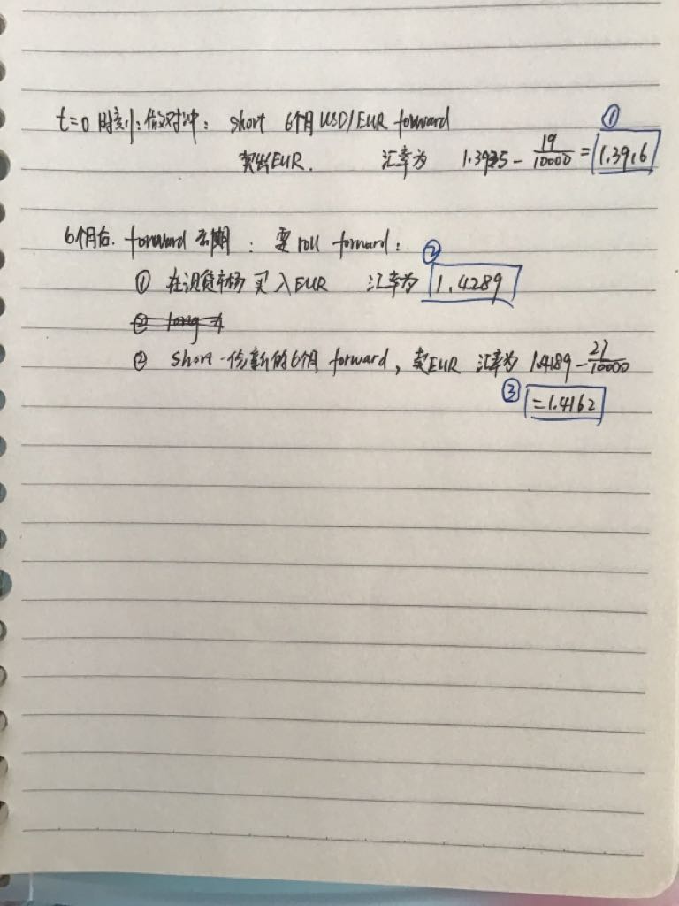 另外,在前一个forward到期的时候,我们卖出EUR的价格是(1.3935-19bps)=1.3916,卖出EUR,获得USD。然后在进入新的short forward时,相当于卖USD买EUR,这样合约期间会持有EUR,将来才能再卖EUR。前一个forward在到期的时间要买EUR,要支出1.4289,说明我们前一个合约卖EUR更便宜,在当前时间再买EUR却是更贵的,所以导致了more negative。