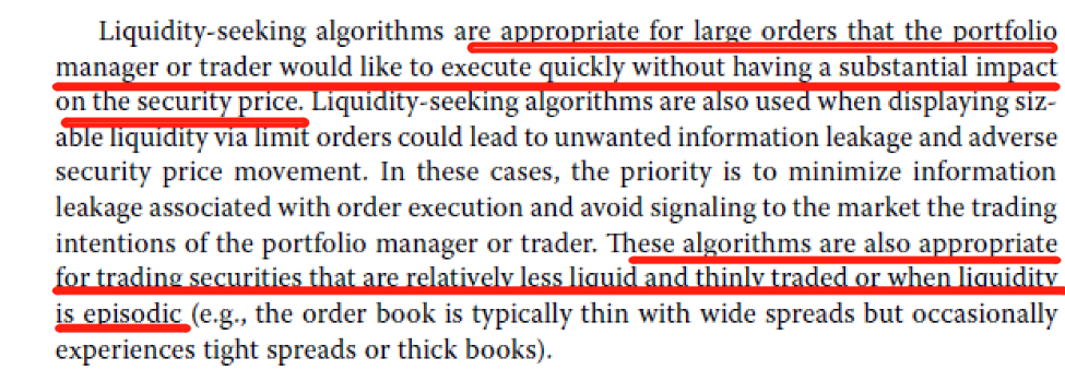 同学你好,liquidity seeking的交易算法适合交易流动性不好的标的,因为它可以多渠道去寻找流动性。但它也可以交易本来流动性较好,但是订单规模较大又需要快速交易的订单,因为此类大单如果直接交易会造成很大的市场冲击成本,而该算法可以通过在多渠道寻找流动性分散市场冲击成本。