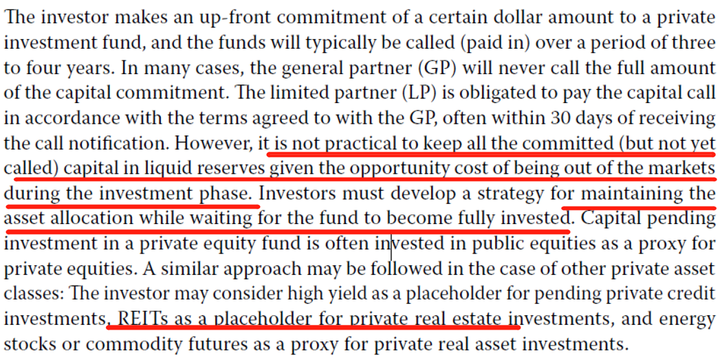 同学你好,因为GP在在向LP发出capital call的时候是会提前通知的,会给一定的时间让LP去准备资金的,因此不一定要配置现金,投资容易变现的资产就可以应付capital call。但准备的这笔资金如果什么都不投就会有机会成本,也不符合期望的资产配置。因此我们就要投流动性好,需要钱的时候可以马上卖出变现,又要和private real estate相关的收益的资产,以维持在房地产方面相应的配置比例。所以全部投资REITS是最好的。