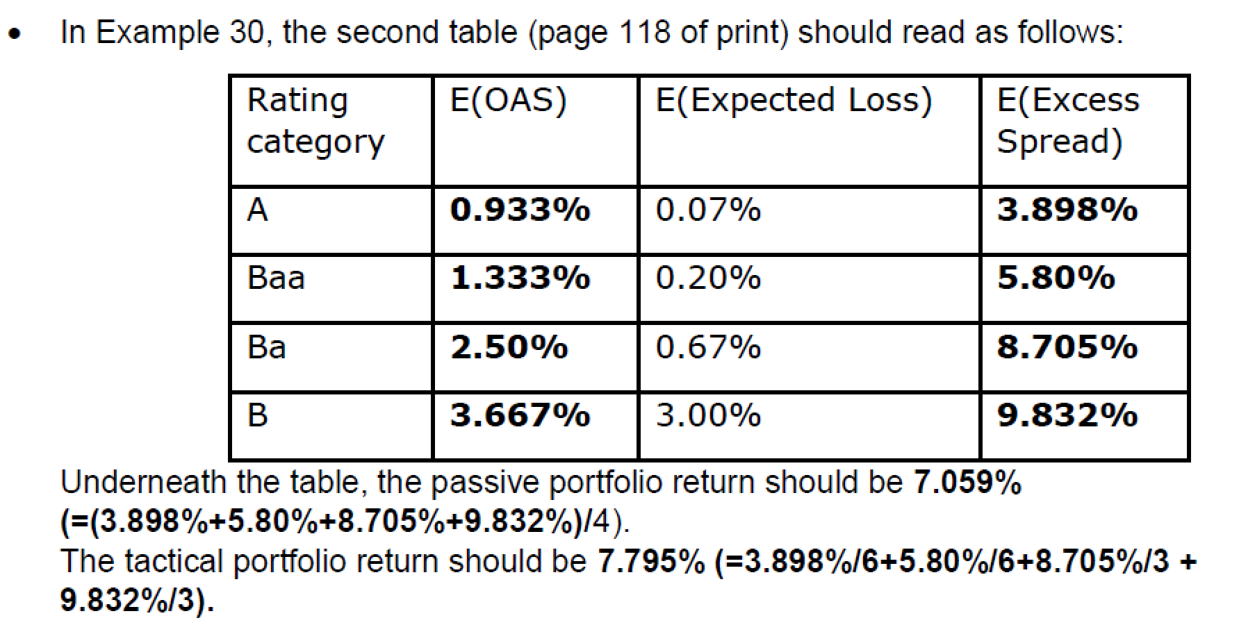 L3V3, example 30. If the credit spread falls by one-third, should the E(OAS) be one-third of the original OAS? Take A as an example, should the E(Excess spread) be 1.4% - 5.5 * (1.4%*1/3) - 0.1% *2/3 ?