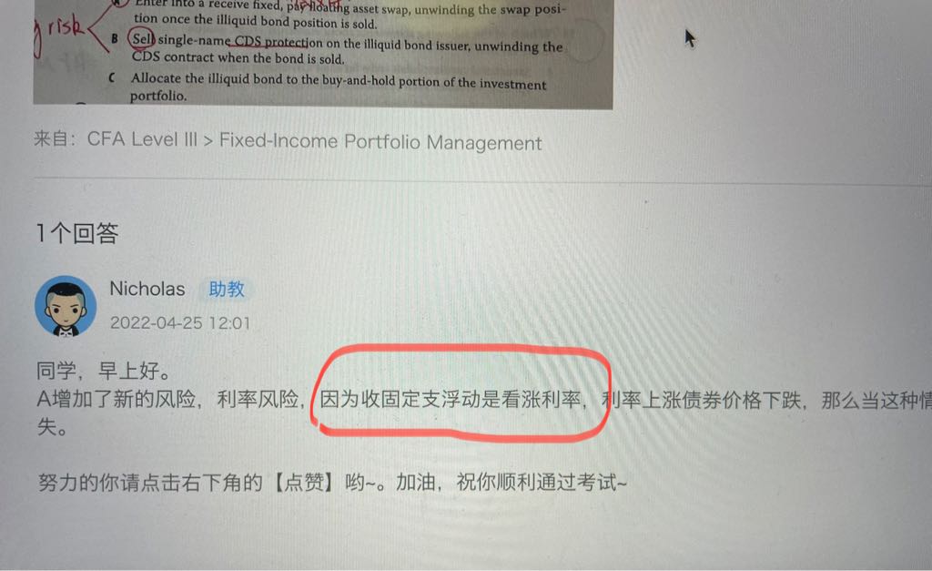 不好意思,之前应该是解答有误,收固定利率(假设为5%),那么浮动利率越低是越好的,相当于市场利率更低,但是我仍然收到固定的5%利率。这里进入互换合约就会增加利率的不确定性,题目是要解决流动性风险问题。