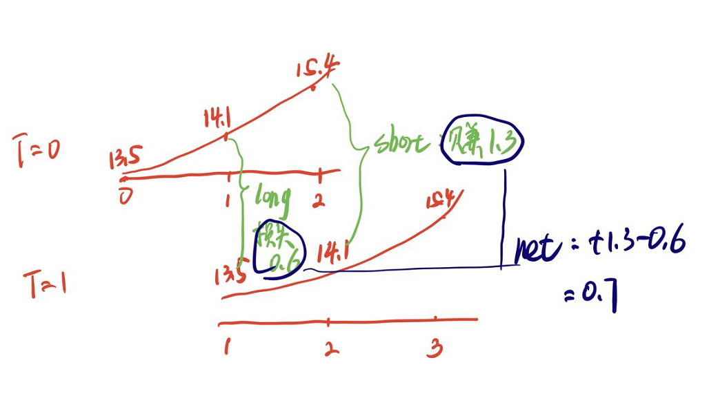 买第一个月的VIX期货(14.1),卖第二个月的VIX期货(15.4),在VIX期限结构不变的情况下,过了一个月,第一份合约到期,到期时的VIX为13.5,由于是多头,因此第一份合约亏损(13.5 – 14.1) = –0.6,第二份合约由原来的15.1下跌到14.1,由于是空头,因此赚取 – (14.1 – 15.4) =1.3,两者结合净赚0.7。