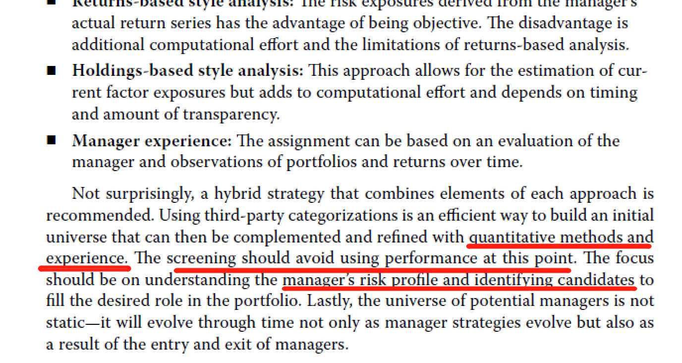 同学你好,这个experience指偏定性的基金经理的从业经验。例如,基金经理有几年的管理此类产品的经验,曾经管理过多少产品。在初步确定基金经理的范围时确实应该避免通过历史业绩进行筛选,主要选符合相关风险收益特征的就行,再结合定性的经验分析去确定适合的基金经理池。