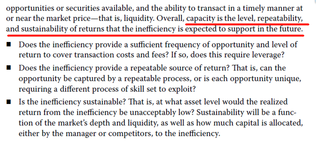根据定义,capacity is the level, repeatability, and sustainability of returns that the inefficiency is expected to support in the future. 无效性的容量指的是无效性带来的收益水平、可复现性和可持续性。具体的三个方面参见下图,和B、C选项是符合的。