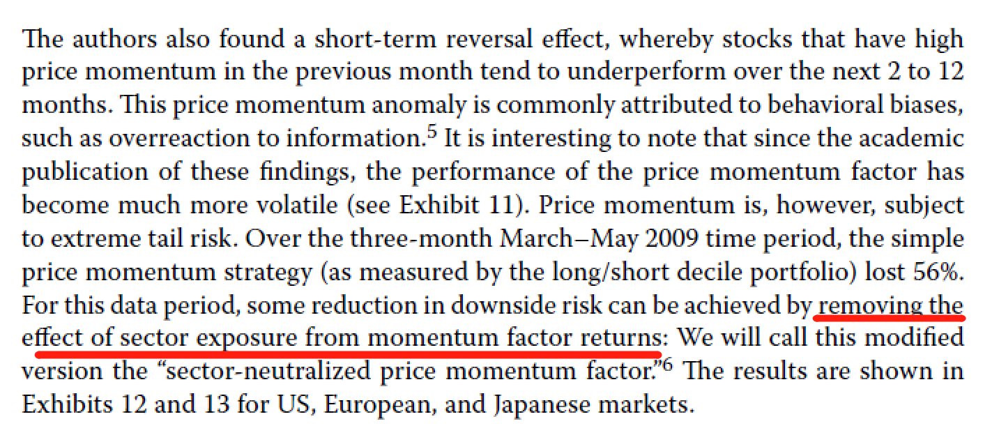 因为如果对动量因子不做处理,那么选出来的股票可能会集中在某个行业。因为momentum factor 是long 表现最好的一批股票,short表现最差的一批股票。那么表现最好的可能集中在某一板块,表现最差的也集中在某个板块,那么如果指按股价涨跌幅去进行选股进行long short,那么股票多头和空头都会有集中的板块敞口。