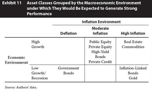 同学你好,可以参考下图,为不同经济状况下预期表现较好的类资产。黄金是一种避险资产,也有抗通胀的作用,因此在通胀高且经济不太好的时候表现最好。在经济增速高通胀高的情况下,real estate和commodity表现最好。