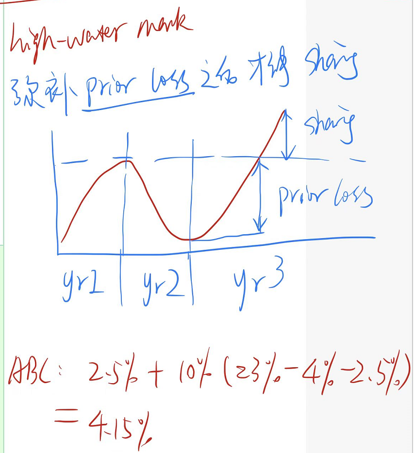麻烦转6月18日晚上的直播课老师,关于高水位那个题目的讲解,第三年要支付的IF等于(第三年的累计收益率-高水位累计收益率-base fee)*share ratio,这个题目有听懂的吗?第三年应该缴纳的IF怎么是用第三年的累计收益率是减呢?IF是每年收取,应该是按照当年收益率收取吧?如果是基于累计收益率去收取的话,是不是就意味着重复收取,比如第一年12%在年末已经说过了,那么第三年应该就是按当年23%剔除高水位12%差额部分收费啊。