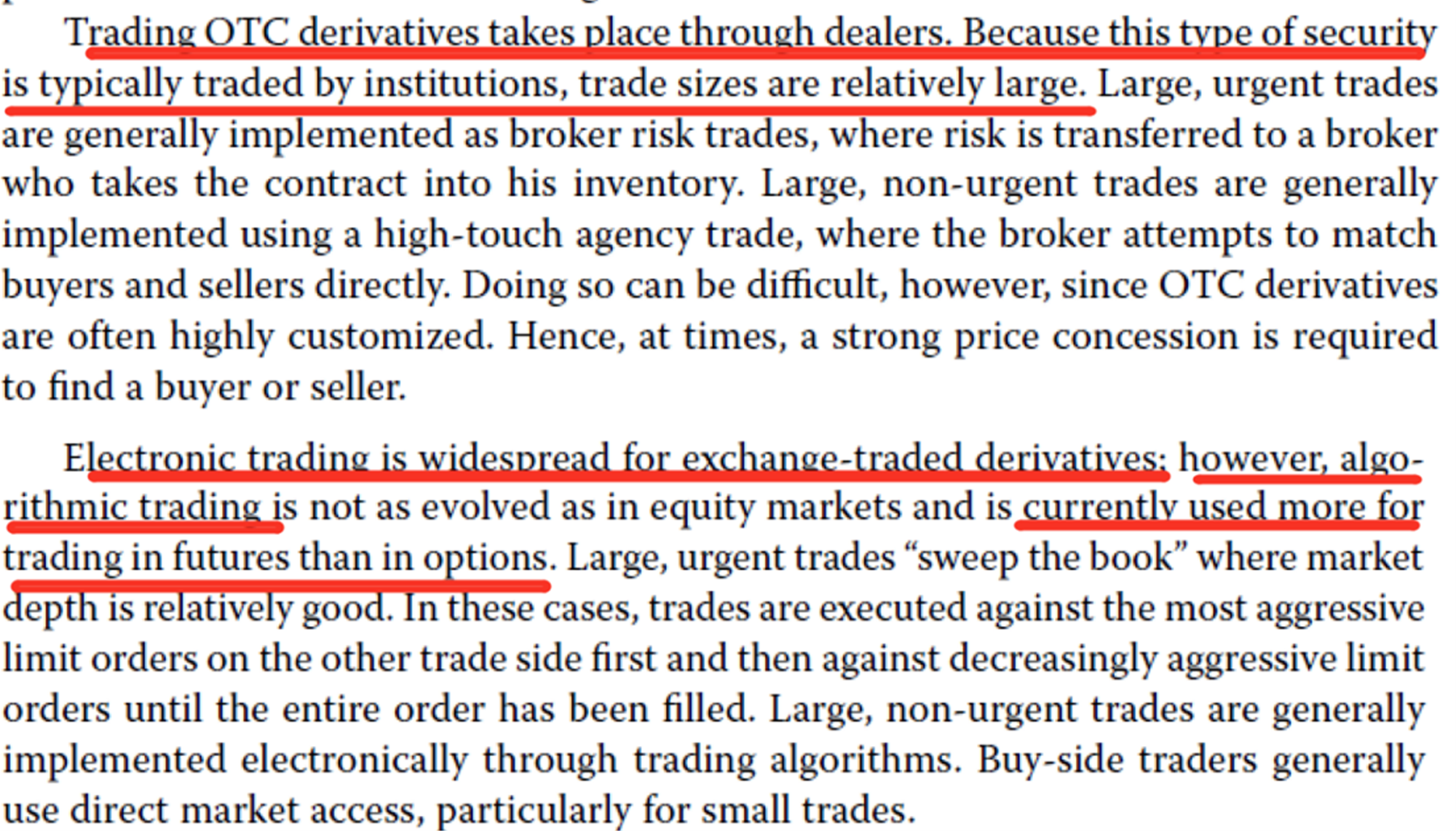 Shui 说,交易所上交易的衍生品的透明度和交易所交易的股票是差不多的,提供交易价格、规模、报价和订单簿的深度全部都是公开可得的。我认为,我们应该探索一下期货市场的算法交易,因为它比期权市场的发展程度更高。对,不论是衍生品还是股票,交易所上市的工具对应的信息都是公开可得的。期货市场的算法交易也比期权市场的更加发达。