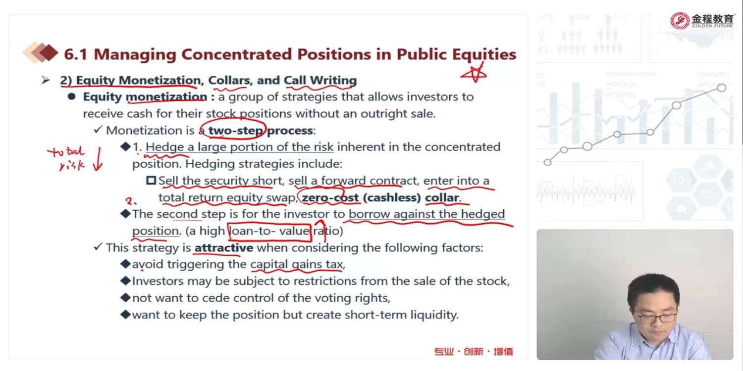 同学你好,这里使用的collar是zero-cost collar,也叫cash-less collar,它会买入一个执行价比当前股价稍高低一些的put,同时卖掉一个执行价略高于当前股价,且到期日相同的call。Call和put都是价外的,他们的期权费相同,一来一去抵消掉就没有成本了,既然net premium为0,那么在期权费这块就没有税收了。而且这个collar还不可以把所有的股票风险全部对冲掉,需要保留一些风险,否则在某些国家的税收制度下,把股票风险全部规避掉就会被视为是出售了股票,那就会产生税收了。