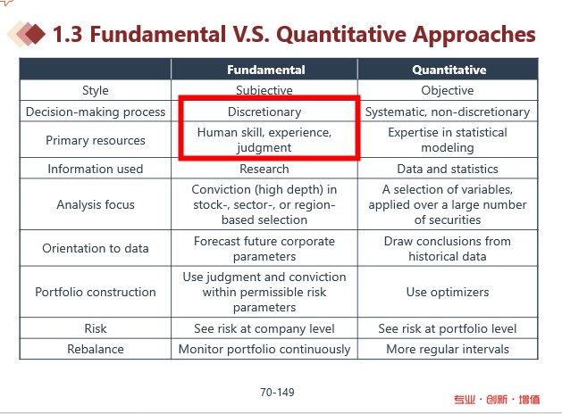 同学,上午好。Manager experience and discretion指的是基金经理的经验和判断,这个是fundamental strategy的特点,不是quantitative。