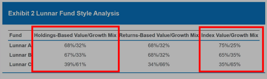 因为holding based(反映current,不受过去影响)比return based(反映过去一段时间的平均,受过去影响)更为准确,所以我们只看holding based和index比较。那么B是和index最接近的。A有7%差异,B有2%差异,C有4%差异。所以选B。