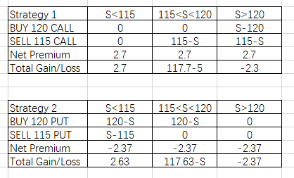 先根据期权策略,计算出各自的gain/loss,见截图1。策略1和2都满足下跌时有profit,上涨时有limit loss。但题目有额外条件minimize cost,1的成本是负的,反而还能收到期权费,所以1要比2合适。