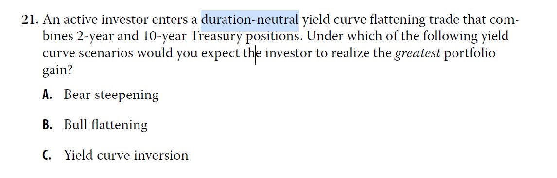 关于此题:因为题目要求是duration-neutral(要保证一买一卖,久期不变),而且题目里预期curve flattening,所以我们会long 长期债,short 短期债。