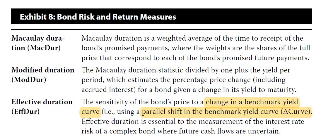 同学,上午好。这是三级中对不同久期的定义。effective duration是yield curve duration。以修正久期和有效久期为例子,前着考虑△YTM对债券价格的影响;后者考虑△curve对债券价格的影响。