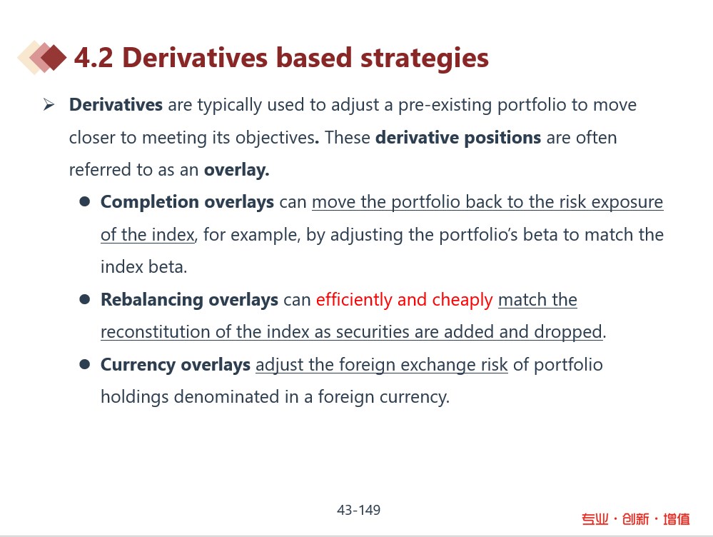 C选项overlay是指使用衍生品来调整组合的债券或股票敞口。特点是cost efficient。符合题目中的要求。