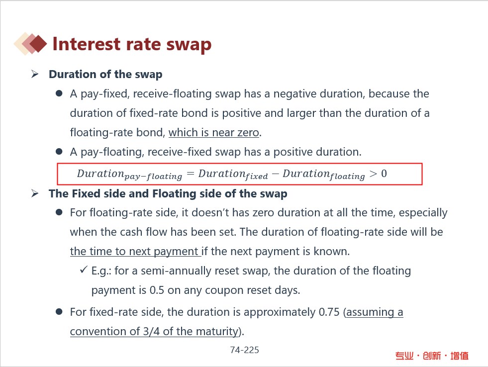 因为固定端久期(支出)会比浮动端久期大(收到)。所以receiving floating, pay fixed的swap的duration小于0