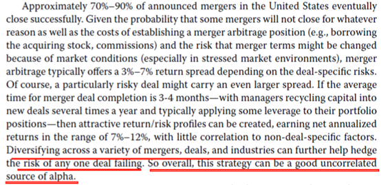 merger arbitrage的收益基本上和并购deal本身相关,meager deal成功,获得 spread return,和市场整体相关性不大。且基金经理可以通过滚动投资于多个不同行业的并购,可以分散deal-specific risk。因此整体来看这个策略一种和股票市场不相关的alpha的来源。因此A是对的。