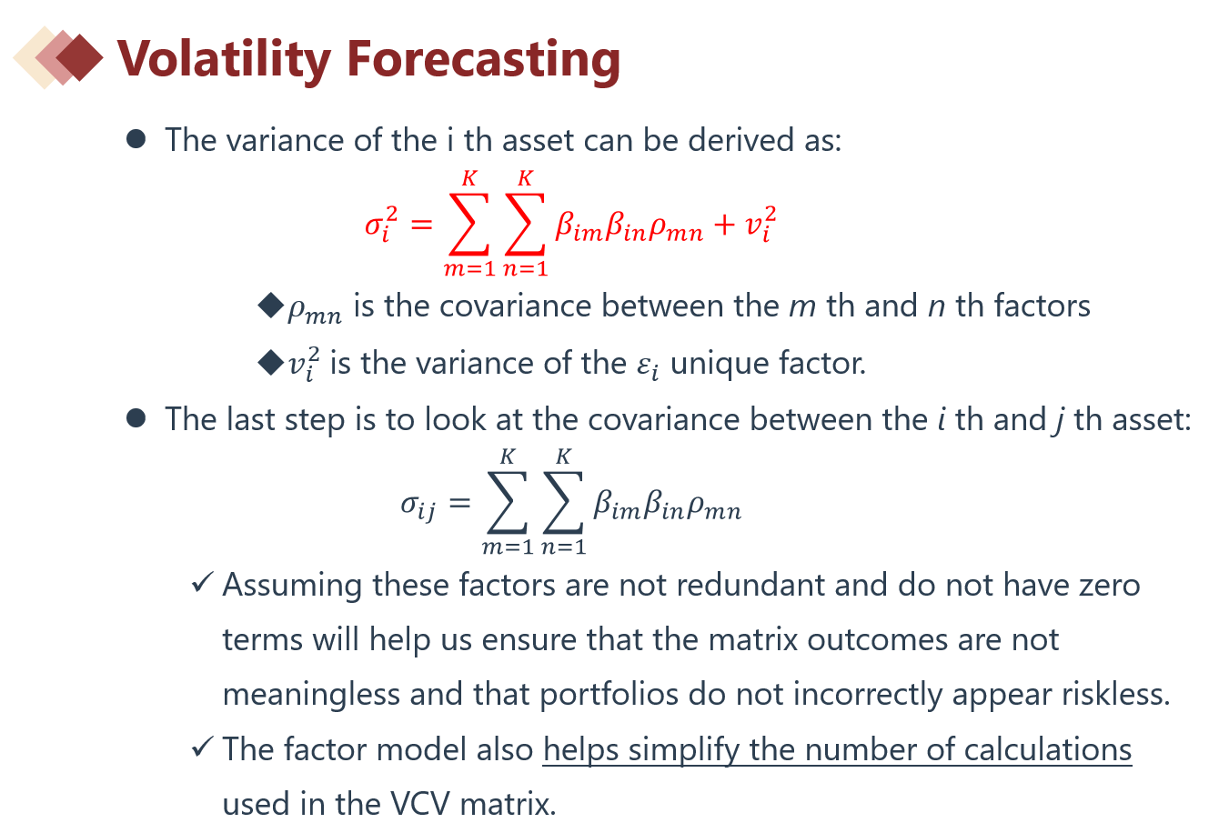 同学你好,这个就是两因子的VCV方差计算,这其实可以类比之前一级所学的投资组合方差计算,这里的因子敏感度就相当于资产的权重了,最后不要忘记加上残差的方差即可。