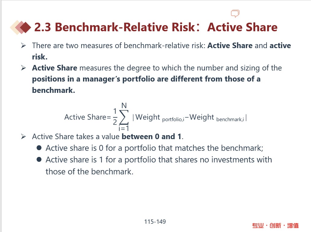 举个例子,benchmark 是【40%中石化,60%工商银行,0%贵州茅台】。portfolio是【40%中石化,40%工商银行,20%贵州茅台】。那么active share是0.2(有20%股票持仓和benchmark不一样)。具体计算是:(20%工商银行+20%贵州茅台)*0.5=0.2。(工商银行有20%和benchmark不一样,贵州茅台有20%和benchmark不一样,所以*0.5是因为20%各算了两遍)