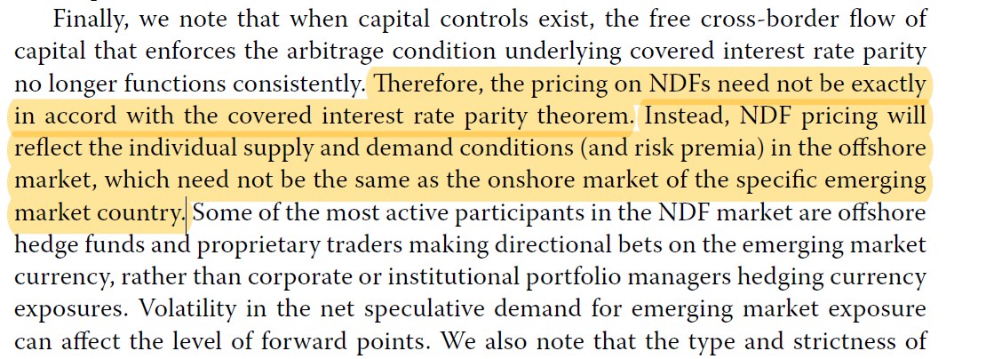 当有国家进行资本管制时,国际间套利所遵循的covered interest rate parity可能会不成立,那么NDFs的价格会和根据Covered IRP理论定出的forward有所偏差。具体NDF价格要根据市场供需来决定,但比forward高还是低,不确定。